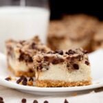 This chocolate chip cheesecake bars recipe is my answer when I can’t decide between cookies or cheesecake. The buttery graham crust, creamy filling, and soft cookie topping come together in every bite.